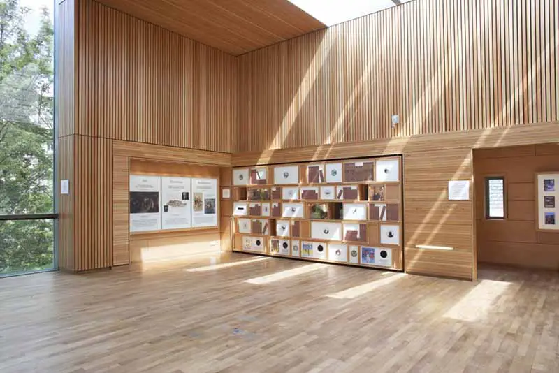 Entries through John Knox House and the new forestair unite the differing levels of the previous buildings with the steep fall of the Royal Mile, gathering all into the Storytelling Court. The Court is informal, a foyer and ceilidh-room with the hospitality of a cafe as its welcome. It is warm and full of light and adapts to form niches and storytelling places via a great, hinged, “wall of stories”. The timber, all in Douglas Fir, is detailed in differing ways relating to the activities in each area. At the upper levels are a series of pre-manufactured slatted panels form a continuous screen on two sides, performing both for acoustic absorption areas and route for the air supply.